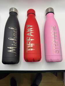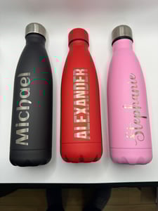 These are 500ml stainless steel insulated water bottles which will keep your drinks hot or cold. They are decorated with a laser engraved Fuelled By Cider logo and can also have an optional name engraved in the back in a font of your choice.